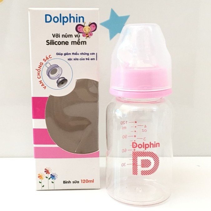 - Bình sữa Dolphin nhựa PC 120 ml tiêu chuẩn với núm vú silicon mềm vừa khớp với miệng giúp bé cử động mút tự nhiên, với lực hút của bé sữa chảy ra đều và có cảm giác như đang bú mẹ.