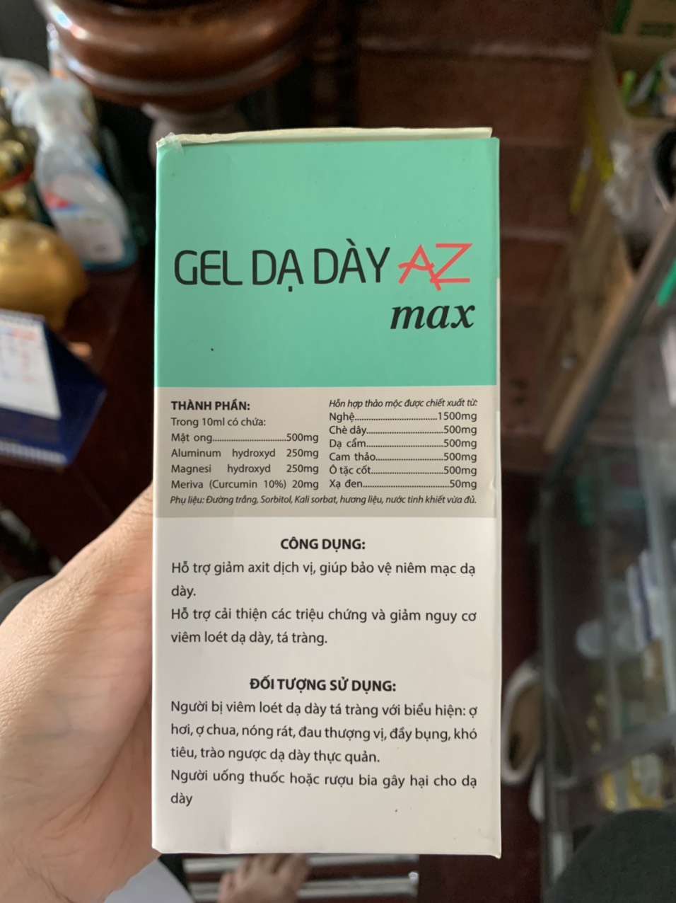 Thành phần: Mật ong 500mg, aluminium 250mg, magnesi 250mg, meriva 20mg, nghệ 1500mg, chè dây 500mg, dạ cẩm 500mg, cam thảo 500mg, ô tặc cốt 500mg xạ đen 50mg.